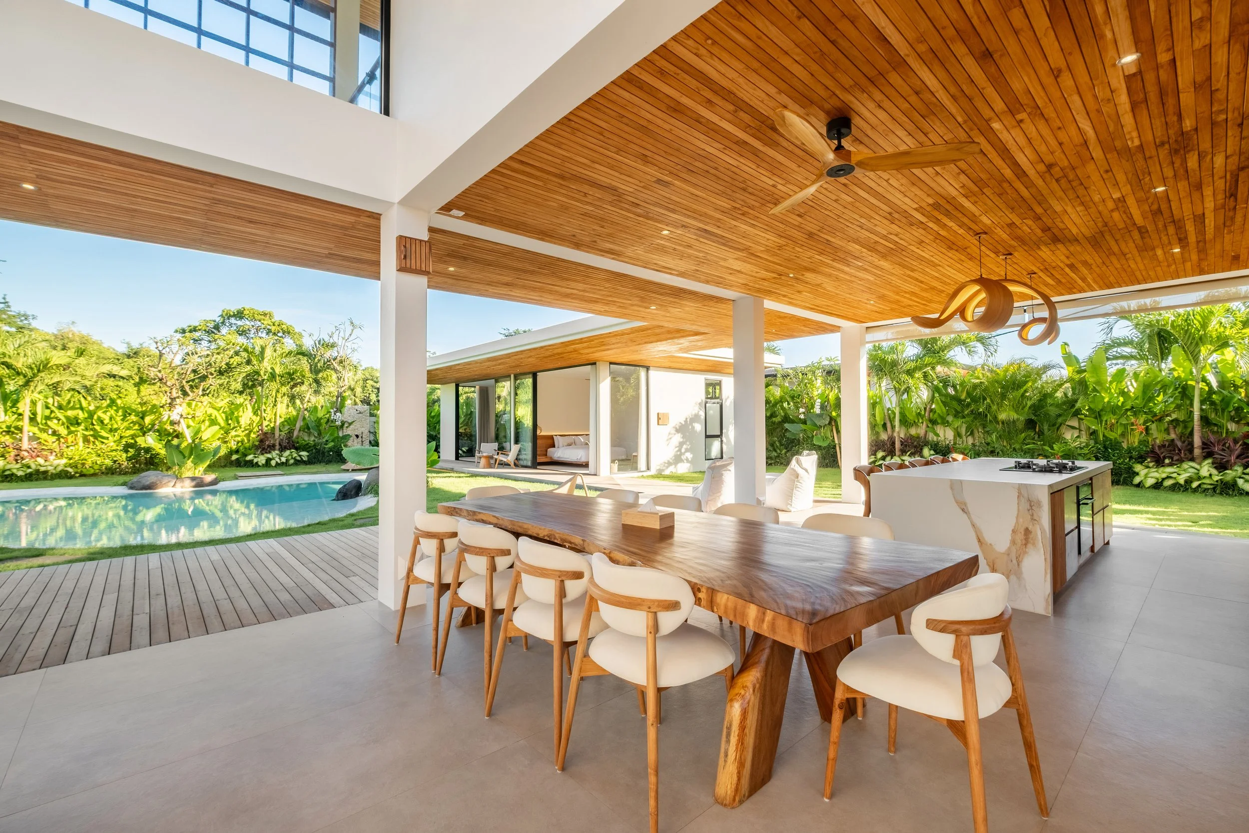 Centered around a peaceful courtyard and private pool, the villa strikes a perfect balance between shared spaces and private retreats. The elegant living and dining area forms the heart of the home, creating a welcoming setting for gatherings, while the surrounding bedrooms and entertainment room provide quiet corners for relaxation and personal time.