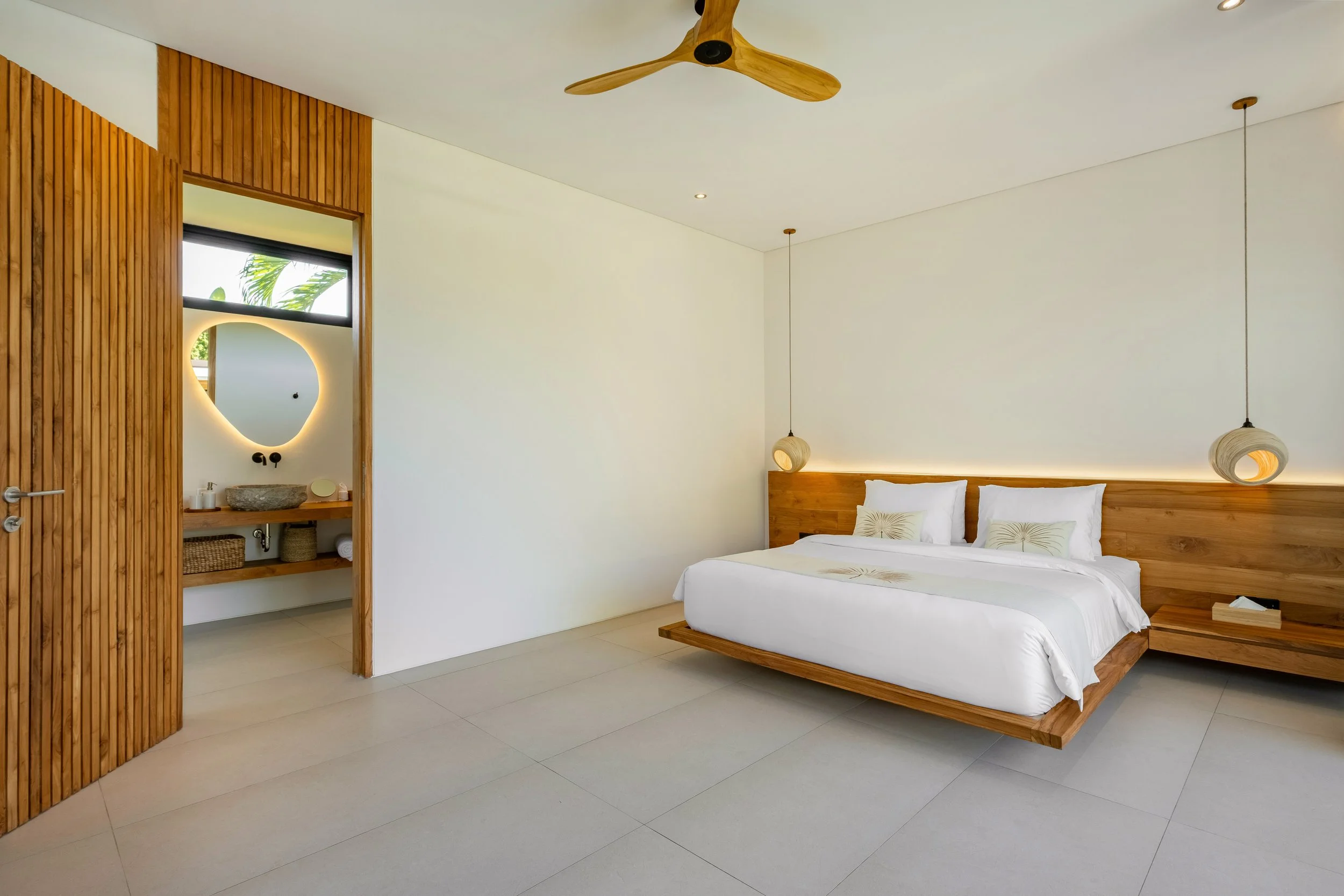 The villa features five spacious bedrooms, each with its own en-suite bathroom to ensure comfort and privacy for every guest. The main suite on the second floor opens into a bright, airy sanctuary with a private balcony overlooking the courtyard and pool, offering a calming space to unwind and take in the surroundings.