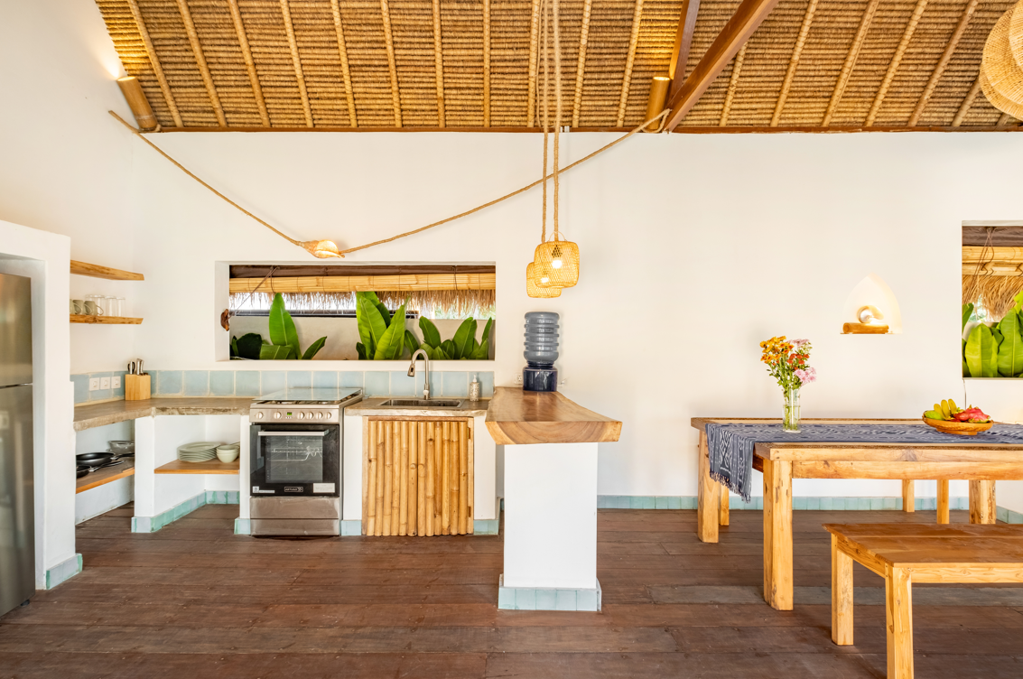 The villa's open-plan living area is the heart of the home. The sofa in the living area providing a perfect spot for relaxation. Adjacent to the living area is the dining space, ideal for hosting intimate dinners with family and friends. The well-equipped kitchen, complete with a kitchenette, offers everything needed to prepare delicious meals.